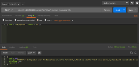 I'm getting started using iControl REST and I'm getting an unexpected error when I try to set security policy for a vs. Here is what I'm sending with postman(a chrome app...