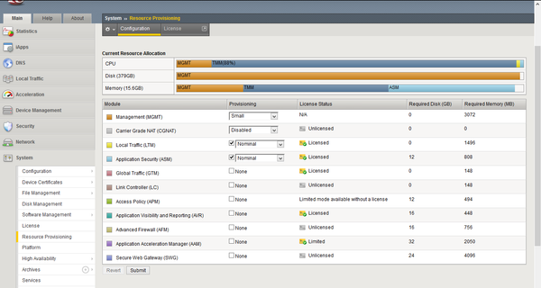 Can you provide a screenshot of the provision you have, including the license part? What is the hardware and version you have? vCMP/VE?