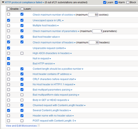 - HTTP protocol compliance failed and the ability to Enable, Learn and Override within this
