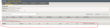 The manual says: If a packet does not match any rule in any context on the firewall, the Global Reject or Global Drop rule drops the packet (Global Drop) or drops the packet and sends the appropriate reject message (Global Reject) even when the system is in a default allow configuration.
