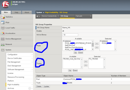 Anyway, a ha group calculates a score and the way to build up and monitor the score is to use either pools, trunks or both. Depending on the up/down status of the pool members or trunk members (interfaces) then a bigip will achieve a score. This is compared to its peer and dictates whether failover occurs.