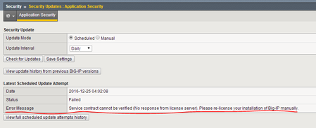 Service contract cannot be verified (NO response from License server). Please re-license your installation of Big-IP manually.