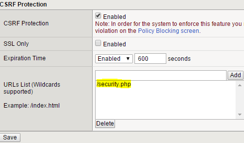 Enable blocking CSRF  Enable CSRF protection on the security.php link  Ensure this CSRF configuration affected correct Virtual Server.After configuration, some stranges we have got: