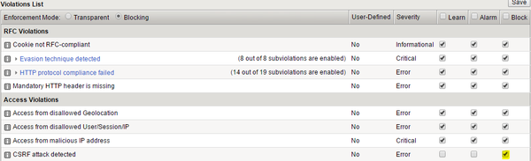 " - I had tried enable all three options (alarm, learn, block) but it's not helped - This is not the dynamic generated code case (the security.php link is static in the homepage) - I wanna see the F5 CSRF token generated with the security.php link, but that not happened. And F5 no blocked CSRF violation when I access security.php without token. "