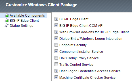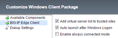 Our connectivity profile / BIG-IP Edge Client package settings are as follows: