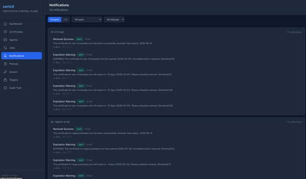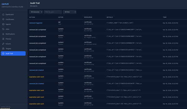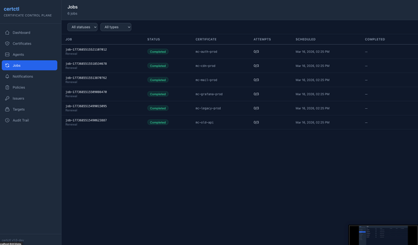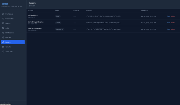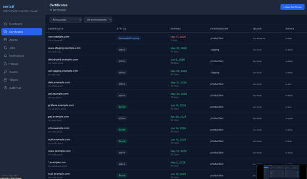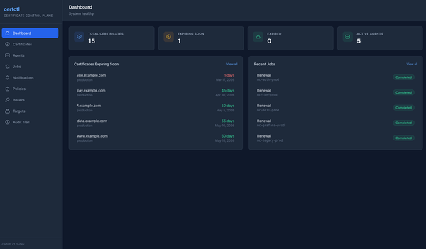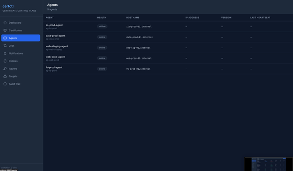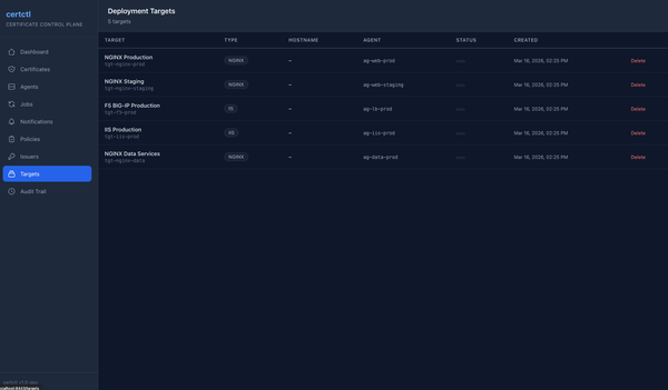 I'm building certctl, a self-hosted certificate lifecycle platform, and F5 BIG-IP is one of the target connectors I'm working on. The platform already handles certificate issuance (built-in Local CA and ACME/Let's Encrypt with HTTP-01 challenges), configurable renewal policies, agent-based key generation (ECDSA P-256, private keys never leave the agent), threshold-based expiry alerting, policy enforcement, and an immutable audit trail. The NGINX target connector is fully implemented. Agents deploy certs via file write, nginx -t validation, and reload.