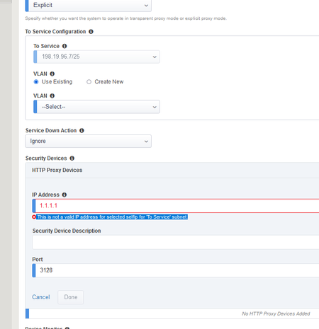 The security device IP has to match the to-service self-IP subnet. That's why you're getting this error.