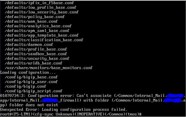 When I to tmsh load sys config, it gets to /config/bigip_script.conf then produces this error: