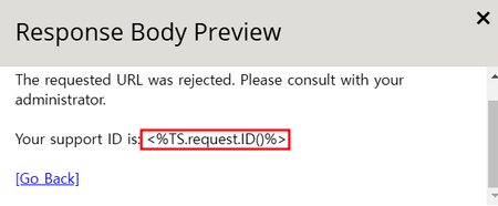 Hi, I want to modify the blocking response page. "Your support ID is: <%TS.request.ID()%>" As follows, I would like to modify the <%TS.request.ID()> part to output something like attack signat...