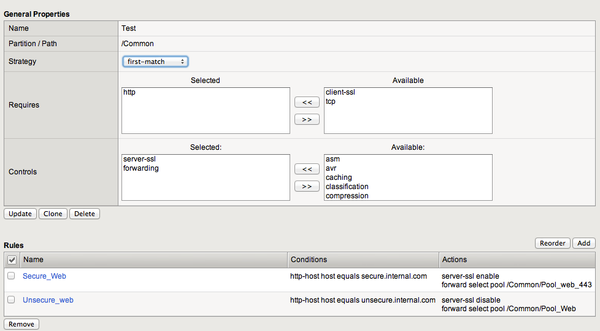 I'm trying to disable SSL server profile on a VS with CPM policy. But unfortunately, I'm not able to make it works. My policy is very simple : - if host = secure.internal.com --> use server SSL profile and forward to secure WEB pool - if host = unsecure.internal.com --> do not use server SSL profile and forward to unsecure web pool