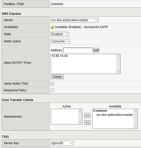Hello Kevin, So, I erased all the DNS configuration and restarted from scratch following the K45411181 and adding the notification virtual server. Although, according to the article, it is not necessary to do so, since i'm not running an HA Cluster, it did solve the "Not authoritative SOA" problem. Unfortunately, it did not solve all my problems. NSD DNS Server does not implement IXFR responses. So unless forcing DNS Express to execute and AXFR each time, I don't think F5 DNS Express and NSD can work toghether (which is a bit strange). Cheers. Hicham