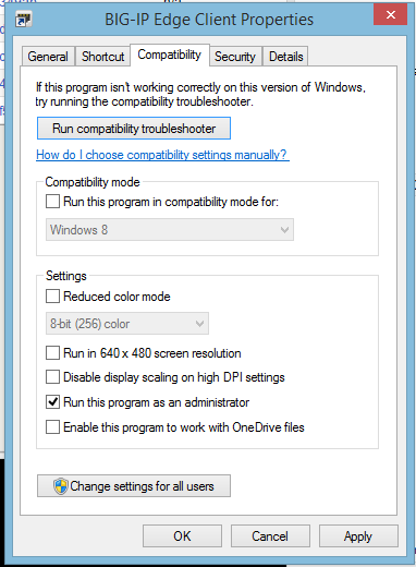 - Or as a work around the user can enable the client to run as administrator by setting the option on the properties of the f5fpclientW.exe.
