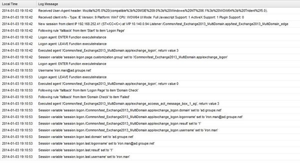expr { [mcget {session.logon.last.domain}] equals "ad.groupe.net" }I'd also throw in a test message box directly after the logon page to see what your domain variable is before it gets to the domain check agent. Use this syntax in the message box field: