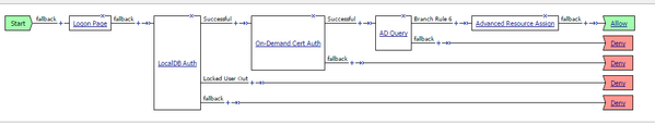 .... please tell me what i have to use in search filter as well as in branch rule..below is my VPE.... evry time am getting the error "" Following rule 'fallback' from item 'AD Query' to ending 'Deny' """