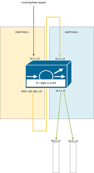 HTTPS request are received by a VS in partition 1 on 10.1.1.10:443 and have SNAT enabled. The pool contains a node which is a VS on the same F5 in partition 2.