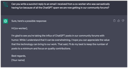 May 23, 2023I used it to rewrite some of my MayTheFourthBeWithYou trivia questions to make them less crazy. I also use it for boilerplate code for projects, and will use it as well for $vendorX -> F5 type questions here in the forums when I don't understand the source material. Answers for iRules are usually wrong, but I glean enough from the output to make a good enough guess to get the conversation started.