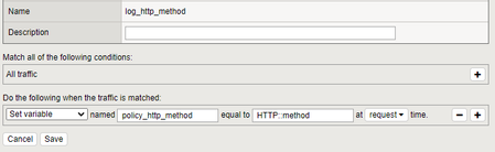 when HTTP_REQUEST { log local0. "$policy_http_method" }