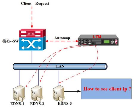 Three dns servers, bind version 9 ,support edns protocol. Now need ltm load balance for three dns servers, ltm open automap function. I can't use tcp:option irules to insert client ip ad...