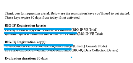 You have 4 keys. The BIG-IP licences are so that you can deploy a HA pair if you like (or two seperate devices). The same goes for the BIG-IQ licences which is the management platform (should you wish to trial that also)