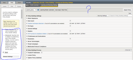 I assume you have v15.1.0. On this version main "Learning and Blocking" settings were moved to main "General Setting" section of policy. Select your policy on "Security ›› Application Security : Security Policies : Policies List" page and look at "Learning and Blocking" section.