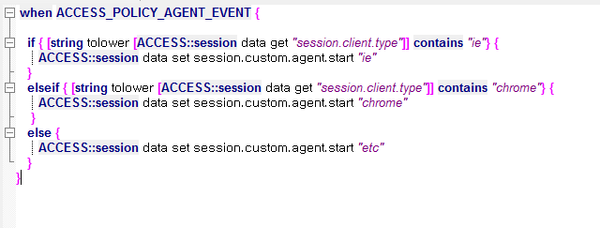 Mozilla/5.0 (Windows NT 6.1; WOW64) AppleWebKit/537.36 (KHTML, like Gecko) Chrome/48.0.2564.116 Safari/537.36 you could have an expression like expr { [mcget { session.user.agent}] contains "Chrome" }Then in that branch rule have the logic you want it to follow.