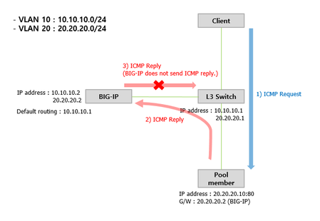 in this scenario , ICMP traffic should go through Bigip to server 20.20.20.10 and return back to F5 big-ip " its gateway"