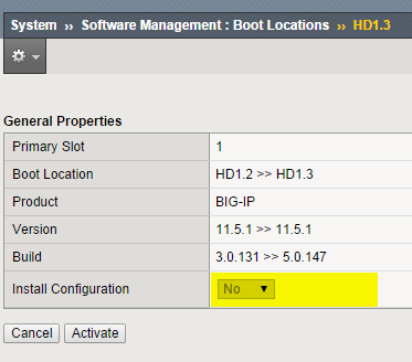 "I have noticed that some versions of code - when running in a vCMP guest - do not give the option of copying over the config via the gui; the option to "Install Configuration" when activating a new boot location is just greyed out. You should still be able to copy the config over using the CLI command "cpcfg". However, whenever a base image or hotfix is installed - the config is copied over automatically."