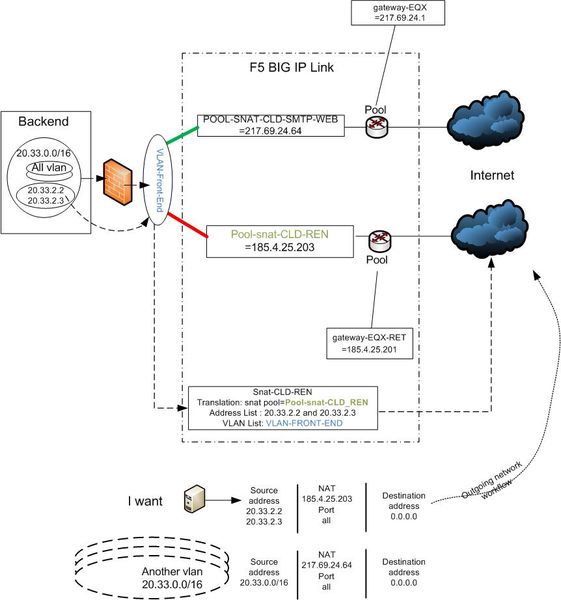 when CLIENT_ACCEPTED { switch [IP::client_addr] { "20.33.2.2" - "20.33.2.3" { snatpool snatpool_CLD-REN pool pool_gateway-EQX-RET } default { snatpool snatpool_CLD-SMTP-WEB pool pool_gateway-EQX } } }The iRule is referencing the individual next hop pools (each containing your specific default gateways) and SNATpools as follows:
