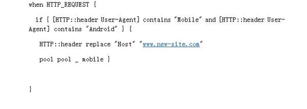 when HTTP_REQUEST { set ua [string tolower [HTTP::header User-Agent]] if { $ua contains "mobile" and $ua contains "android" } { HTTP::header replace "Host" "www.new-site.com" pool pool_mobile } }/Patrik
