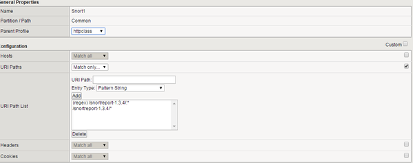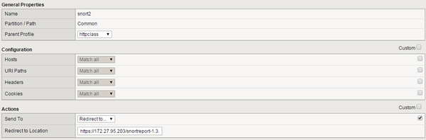 as an equivalent my iRule would look like this:when HTTP_REQUEST { if { ! ([string tolower [HTTP::uri] starts_with /snortreport-1.3.4/) } { HTTP::redirect "https://172.27.95.203/snortreport-1.3.4/" } }As your 2nd screenshot does not contain the full redirection path it might be necessary to modify the path in the iRule above.
