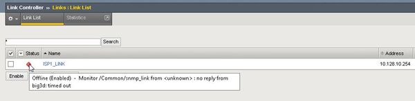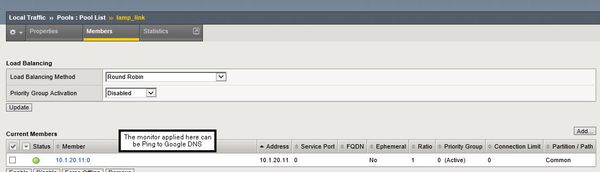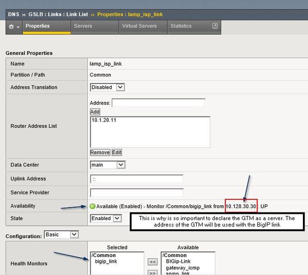 My default GW's pool configuration My default gw conf My GTM server within the DC (check the ip address 10.1.20.224, it's in the same network range as my ISP link) The default BigIP_link monitor And the link itself