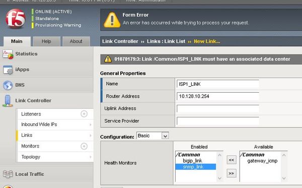 Right now i was able to test the outbound traffic on my Link Controller (Default GW pool= The two ISP links) My problem comes when, following the LC configuration guide v11 (page 27), i create the links but i get an error: first it says that the link must have an associated data center.