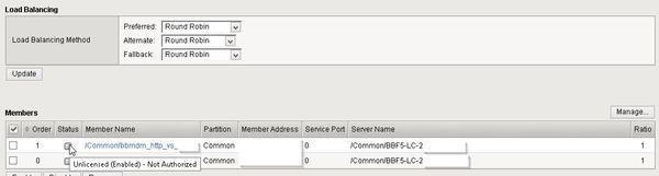 Are you found any solution for this problem?. We have the same situation, 3 links, 22 WIP with 6 VS each, round robin load balance, only 2 VS respond, the other 4 VS appear like "Unlicensed (Enabled) - Not Authorized"