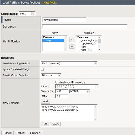 create ltm pool deadpool load-balancing-mode ratio-member members add { 1.2.3.4:80 { ratio 80 } }jaikumar_f5