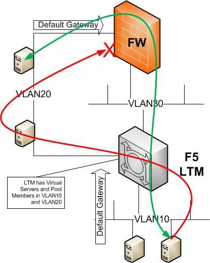 I have a scenario in which my LTM is the default gateway for all hosts on VLAN10. The LTM also has a directly connected interface in VLAN20. However, hosts in VLAN20 do not use the LTM as the gateway. Their default gateway is a firewall. The reason VLAN20 exists on the LTM is because it has Virtual Servers and their pool members with those IPs. I have a 0/0 IP Forwarding Virtual Server and a Default System route of the FW on VLAN30.