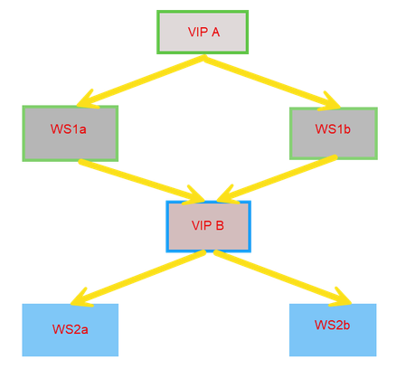 I don't believe this is achievable without performing at least SSL termination on both virtual server(VS) A and VS B. If you are performing SSL termination you can create 3 pools, one for VS A with WS1A and WS1B in them, then one with WS2A, and the final pool with only WS2B in it. You can then configure header insertion on VS A and have it insert a header with a value of WS1A for that server or WS1B for that server. On VS B you will have another iRule that searches for the respective HTTP header and then balances that traffic to WS2A if WS1A is found in the header or WS2B if WS2B is found in the header.