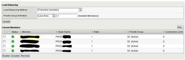 I have 4 members in a pool, we have noticed that traffic is being directed to only one member of the pool. The pool member receiving the traffic seems change on daily basis. A four members have the priority group set to 50, the load balancing method is predictive (member). We expected the traffic to be shared across all members of the pool.