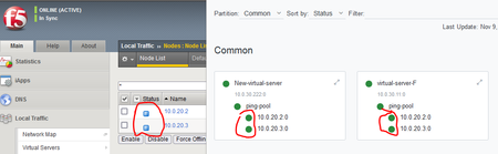 - open the Nodes list again you will see it becomes available like below snap shot :> I recommend that , Do not assign much health monitors on your device , the pool members health monitors is sufficient , make your virtual server or application available.