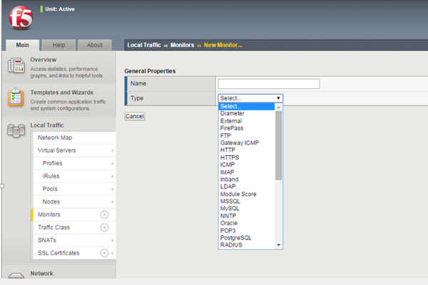 We are having an issue with finding all of our LTM monitors. On our one LTM in the DMZ, if you go to "Local Traffic", then "Monitors", and then hit the "create" button on the far right, it brings you to this screen: