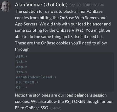 My question is around how do you only allow specific cookies to the pool members. According to a post on the applications support site the way this was fixed was by "block all non-OnBase cookies". My...