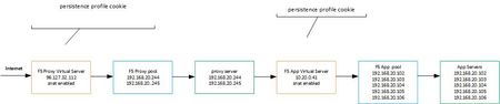 Assuming I understand your setup right (Nice diagram BTW), you want to put your persistence on the second (App VS) BigIP. Persistence is to keep you hitting the same backend. So on the proxy, it doesn't make sense. As it looks like the proxy only hits the 1 app VS.