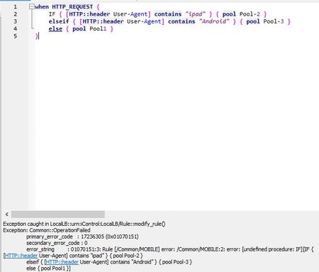 when HTTP_REQUEST { if { [HTTP::header User-Agent] contains "ipad" } { pool Pool-2 } elseif { [HTTP::header User-Agent] contains "Android" } { pool Pool-3 } else { pool Pool1 } }Many thanks,