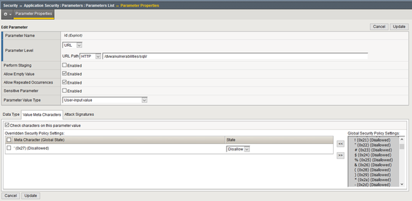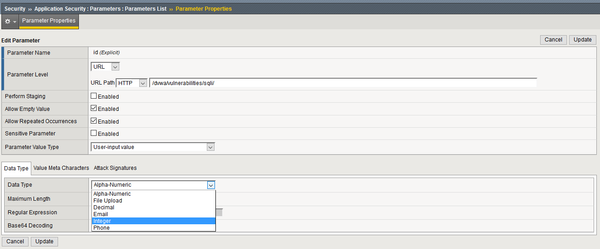 My problem starts here since I don't want this error to show. Instead, I wish to reject URL like when using full exploitation string. So I : - go into Security ›› Application Security : Parameters : Parameters List - click on ID parameter - Now, as seen on picture below, I try to mitigate it through one of the 2 ways: 1. I set data type to INTEGER -> from my understanding, this should allow only integers to be inputted into ID field, or otherwise show error page or whatever? 2. I disallow Meta Character 0x27(single quote)