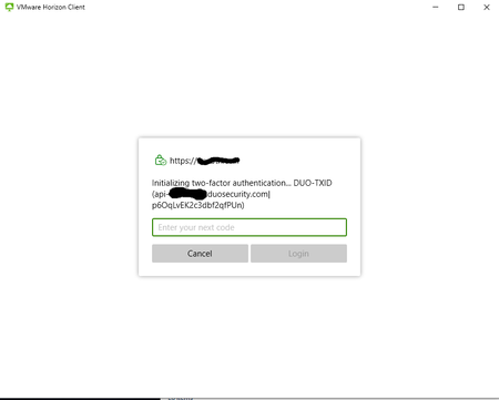 However, when we tried to see how it works directly through the VMware Horizon client, we are "stuck" at the connecting stage and are not being redirected or prompted for a Duo challenge.