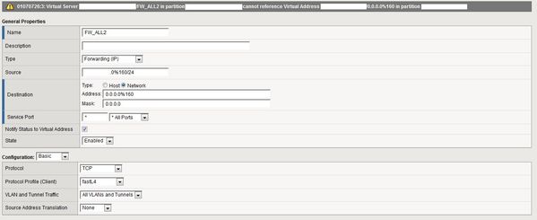 On BIG-IP LTM 11.5.3 HF3 : I have 4 partitions on the same vlan and I would like to configure on each partition an ip forwarding with different source (subnet in the vlan) but with same destination (0.0.0.0/0) Unfortunately I have an error during the creation of the 2nd ip forwarding : "01070726:3: Virtual Server //FW_ALL in partition cannot reference Virtual Address //0.0.0.0% in partition "