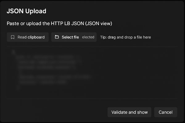 javascript:(async()=>{const H=h=>{if(!h)return'';const i=h.invert_match?%27NOT %27:%27%27;const n=(h.name||%27%27)+%27%27;if(n.toLowerCase()===%27host%27){if(h.regex)return`${i}Host Regex: ${h.regex}`;if(h.exact)return`${i}Host: ${h.exact}`;if(h.match_value)return`${i}Host: ${h.match_value}`;if(h.value)return`${i}Host: ${h.value}`;if(Array.isArray(h.values)&&h.values.length)return`${i}Host in [${h.values.join(%27 | %27)}]`;return`${i}Host Header Present`}if(h.regex)return`${i}Header Regex: ${n} ~ ${h.regex}`;if(h.exact)return`${i}Header: ${n} = ${h.exact}`;if(h.match_value)return`${i}Header: ${n} = ${h.match_value}`;if(h.value)return`${i}Header: ${n} = ${h.value}`;if(Array.isArray(h.values)&&h.values.length)return`${i}Header: ${n} in [${h.values.join(%27 | %27)}]`;return`${i}Header: ${n} (present)`},S=t=>{try{let s=t.replace(/^\uFEFF/,%27%27).replace(/\u200B/g,%27%27);s=s.replace(/\/\*[^]*?\*\//g,%27%27);s=s.replace(/(^|[^:])\/\/.*$/gm,%27$1%27);s=s.replace(/,\s*([}\]])/g,%27$1%27);return s}catch{return t}},J=t=>{if(!t)return null;try{return JSON.parse(t)}catch{try{return JSON.parse(S(t))}catch{return null}}},G=()=>{try{return(getSelection()?.toString()||%27%27).trim()}catch{return%27%27}},D=()=>{const o=[];document.querySelectorAll(%27pre,code,textarea,div%27).forEach(el=>{const t=(el.innerText||el.textContent||%27%27).trim();if(t&&t.includes(%27"spec"%27)&&t.includes(%27"routes"%27)&&t.includes(%27"metadata"%27))o.push(t)});return o},P=a=>{for(const r of a){let t=r,i=t.indexOf(%27{%27),j=t.lastIndexOf(%27}%27);if(i>=0&&j>i)t=t.slice(i,j+1);const x=J(t);if(x?.spec?.routes)return x}return null},M=()=>{try{if(window.monaco?.editor?.getModels){for(const m of window.monaco.editor.getModels()){const txt=m.getValue?.();const j=J(txt);if(j?.spec?.routes)return j}}}catch{}return null},Q=onOk=>{const host=document.createElement(%27div%27),shadow=host.attachShadow({mode:%27open%27}),ov=document.createElement(%27div%27);ov.style.cssText=%27position:fixed;inset:0;z-index:1000000;background:rgba(0,0,0,.55);display:flex;align-items:center;justify-content:center;outline:none;%27;ov.tabIndex=0;const box=document.createElement(%27div%27);box.style.cssText=%27width:min(960px,92vw);height:min(76vh,720px);background:#111;color:#eee;border:1px solid #444;border-radius:10px;box-shadow:0 8px 24px rgba(0,0,0,.35);display:flex;flex-direction:column';const head=document.createElement('div');head.style.cssText='padding:10px 12px;border-bottom:1px solid #333;font:600 14px system-ui';head.textContent='Pega o carga el JSON del HTTP LB (vista JSON)';const bar=document.createElement('div');bar.style.cssText='display:flex;gap:8px;align-items:center;padding:8px 12px;border-bottom:1px solid #333';const btnRead=document.createElement('button');btnRead.textContent='📋 Leer portapapeles';btnRead.title='Requiere permiso del navegador';btnRead.style.cssText='background:#2b2b2b;color:#ddd;border:1px solid #444;border-radius:6px;padding:6px 10px;cursor:pointer';btnRead.onclick=async()=>{try{const txt=await navigator.clipboard.readText();ta.value=txt;ta.focus()}catch{alert('No se pudo leer del portapapeles. Permite el permiso o usa Archivo.')}};const file=document.createElement('input');file.type='file';file.accept='.json,.txt,application/json,text/plain';file.style.cssText='color:#bbb';file.onchange=async e=>{const f=e.target.files?.[0];if(!f)return;const txt=await f.text();ta.value=txt;ta.focus()};const tip=document.createElement('div');tip.style.cssText='margin-left:auto;color:#aaa;font-size:12px';tip.textContent='Consejo: arrastra y suelta un archivo aquí';bar.append(btnRead,file,tip);const ta=document.createElement('textarea');ta.style.cssText='flex:1;padding:10px 12px;background:#0f0f0f;color:#eee;border:0;outline:none;resize:none;font:12px/1.4 ui-monospace,Menlo,Consolas,monospace';ta.placeholder='Pega aquí el JSON (Ctrl+V). Si la página intercepta, usa "Leer portapapeles" o Archivo.';const pasteToTa=async e=>{try{let d=e.clipboardData?.getData('text/plain');if(!d&&navigator.clipboard?.readText)d=await navigator.clipboard.readText();if(typeof d==='string'){const st=ta.selectionStart??ta.value.length,en=ta.selectionEnd??ta.value.length;ta.value=ta.value.slice(0,st)+d+ta.value.slice(en);const pos=st+d.length;ta.setSelectionRange(pos,pos);ta.focus()}}catch{}};const globalPaste=e=>{e.stopImmediatePropagation?.();e.stopPropagation();e.preventDefault();pasteToTa(e)};window.addEventListener('paste',globalPaste,true);ta.addEventListener('dragover',e=>{e.preventDefault();ta.style.outline='1px dashed #555'});ta.addEventListener('dragleave',()=>ta.style.outline='');ta.addEventListener('drop',async e=>{e.preventDefault();ta.style.outline='';const f=e.dataTransfer.files?.[0];if(f)ta.value=await f.text()});const foot=document.createElement('div');foot.style.cssText='display:flex;gap:10px;justify-content:flex-end;padding:10px 12px;border-top:1px solid #333';const ok=document.createElement('button');ok.textContent='Validar y mostrar';ok.style.cssText='background:#2b2b2b;color:#ddd;border:1px solid #444;border-radius:6px;padding:6px 12px;cursor:pointer';ok.onclick=()=>{const j=J(ta.value);if(!(j?.spec?.routes)){alert('No parece un JSON válido con spec.routes.\nAsegúrate de copiar la vista JSON completa.');return}cleanup();onOk(j)};const cancel=document.createElement('button');cancel.textContent='Cancelar';cancel.style.cssText='background:#222;color:#bbb;border:1px solid #444;border-radius:6px;padding:6px 12px;cursor:pointer';const cleanup=()=>{try{window.removeEventListener('paste',globalPaste,true)}catch{}host.remove()};cancel.onclick=cleanup;foot.append(ok,cancel);box.append(head,bar,ta,foot);ov.append(box);shadow.append(ov);document.body.append(host);setTimeout(()=>ta.focus(),0);ov.addEventListener('mousedown',()=>ta.focus())},A=()=>{const s=G();let j=J(s);if(j?.spec?.routes)return Promise.resolve(j);j=M();if(j?.spec?.routes)return Promise.resolve(j);const hits=D();j=P(hits);if(j?.spec?.routes)return Promise.resolve(j);return ne