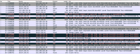 I´ve a wierd ssl connection build-up issue. It looks like a normal SSL Client hello/server hello but in line 24 the connection seems to be interrupted somehow.