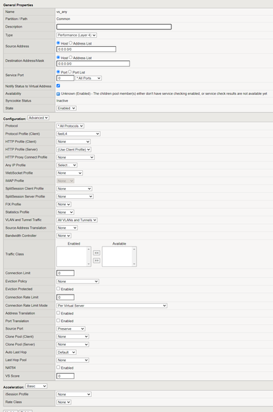 2- change " protocol profilr client " from ( FastL4 to anyip ) and update your changes.