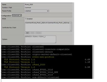 we have disabled TLSv1.0 and 1.1 via DEFAULT:!TLSv1:!TLSv1_1 but still it is showing TLS1.0 on iFund_2020 SSL profile while checking on CLI. Can you suggest TLSv1.0 is still using for this VIP or not...