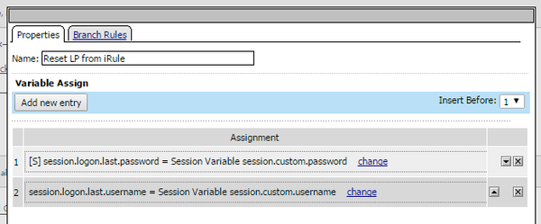 The username and password are set by an iRule (before the user enters this access policy, the credentials are pulled from other HTTP POST headers). The credentials are provided before the start of the access policy, so I cannot set them directly in my iRule. I have to store them in custom session parameters, then use the first VPE action (a Variable Assign) to copy the custom parameters into the standard place.